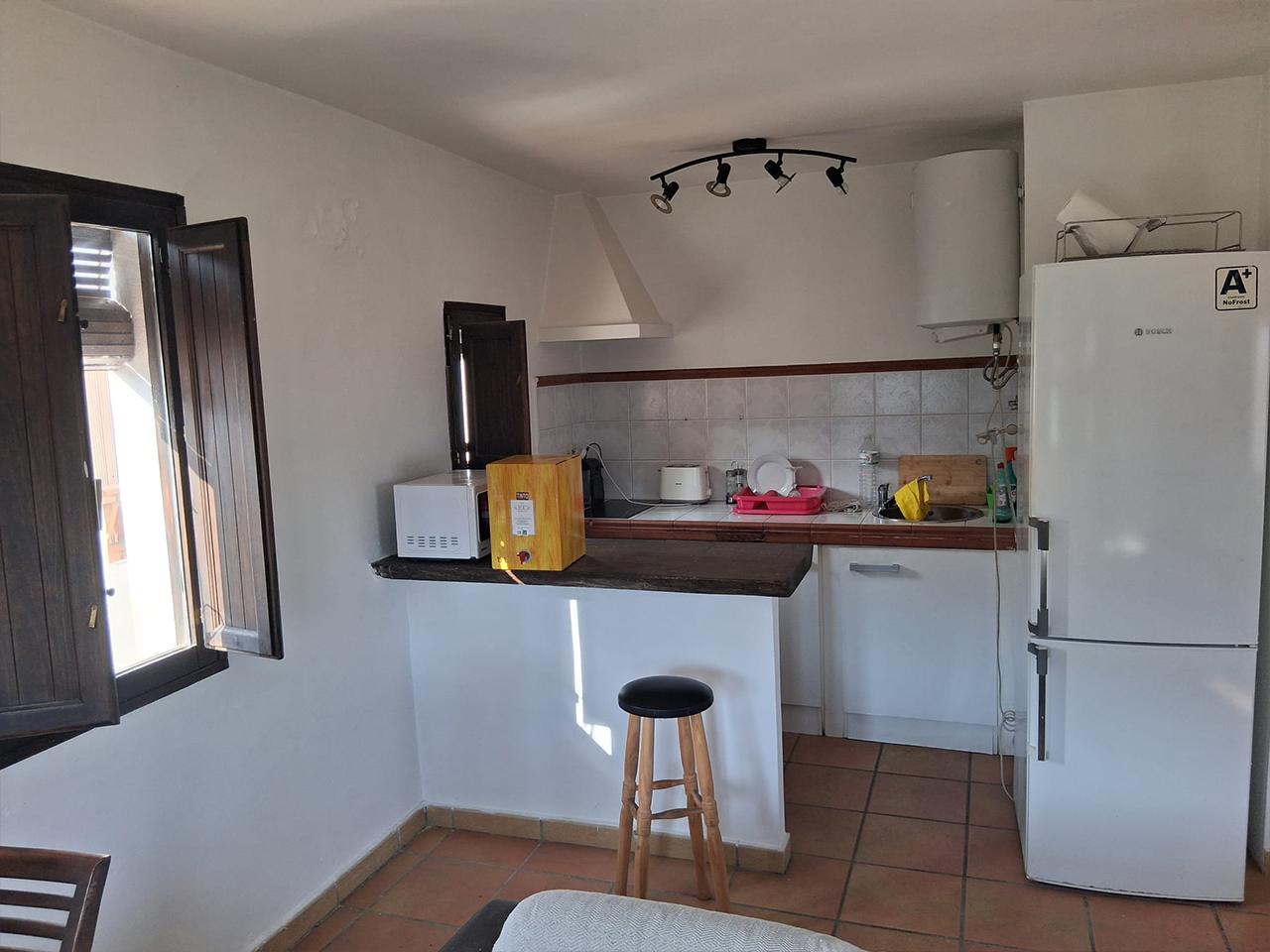 Tiene luz, agua, calentador, vitrocerámica.